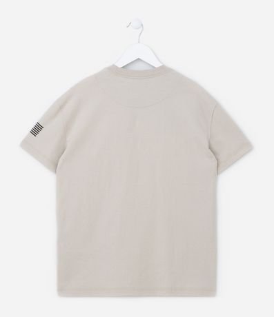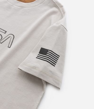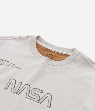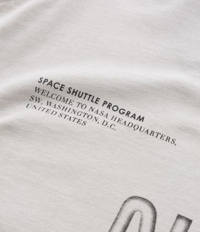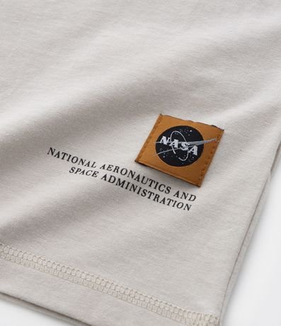 Camiseta infantil confeccionada em algodão mais responsável, de modelo oversized, com golinha redonda, manga curta e estampa localizada da NASA.