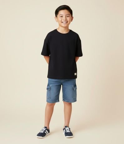 Camiseta infantil de modelo oversized, confeccionada em suedine de material e processo mais sustentáveis. Possui gola redonda, manga curta, etiqueta aplicada na barra e sem estampa.
