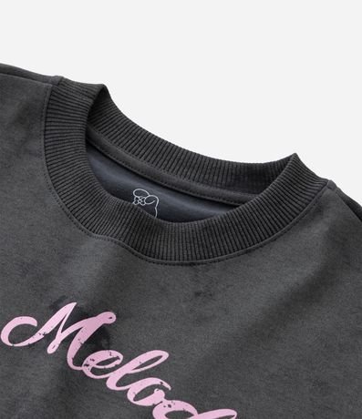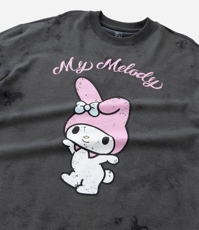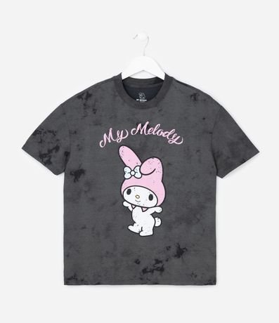 Ref: Camiseta infantil confeccionada em algodão mais sustentável através de boas práticas ambientais, no modelo oversized. Possui gola redonda, manga curta, marmorizada, com estampa e lettering "My Melody".