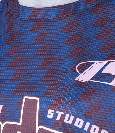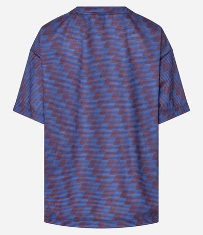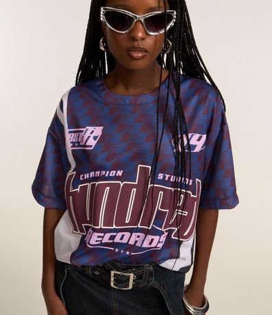 Ref: Camiseta oversized confeccionada em tule. A peça com estampa estilo esportivo tem gola redonda e mangas curtas.