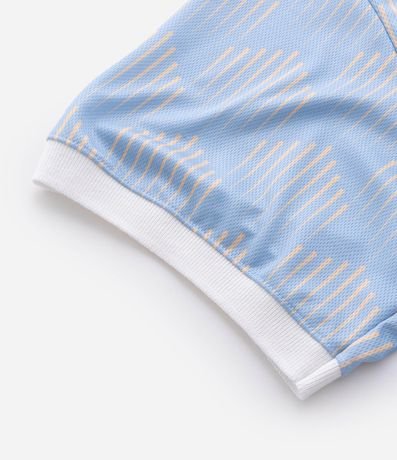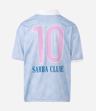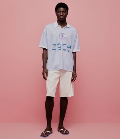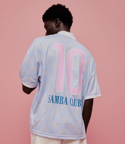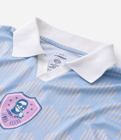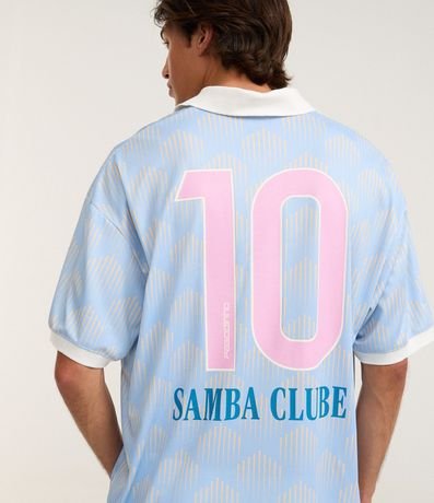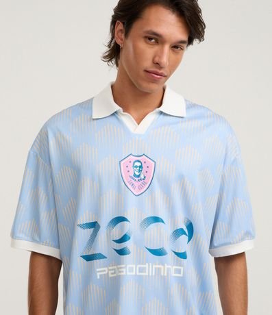 Ref: Camiseta masculina oversized confeccionada em poliéster, com gola polo e manga curta. Possui estampa de fundo geométrica e detalhes temáticos Zeca Pagodinho, incluindo número nas costas e brasão frontal.