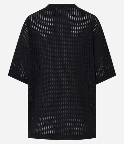 Camiseta feminina de modelo oversized confeccionada em tricô, com gola redonda e mangas curtas. Possui textura de pontos abertos e estampa floral do número 86.