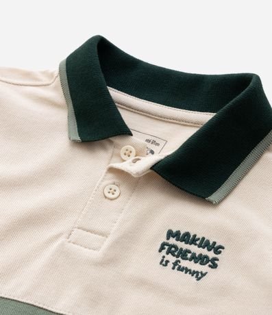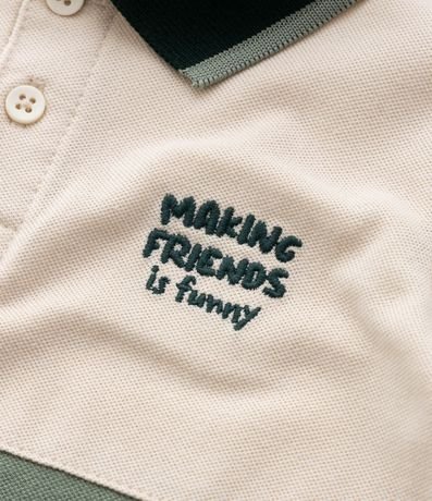Camiseta infantil com gola polo, mangas curtas e estampa de bloco de cores com lettering bordado no peito "Making friends is funny". O item é confeccionado com boas práticas ambientais e algodão certificado bci.