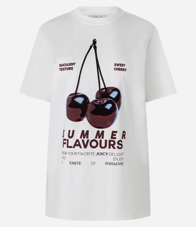Ref: Camiseta feminina confeccionada em algodão certificado bci com boas práticas ambientais, peça no modelo regular com gola redonda, manga curta e estampa de cereja com lettering.