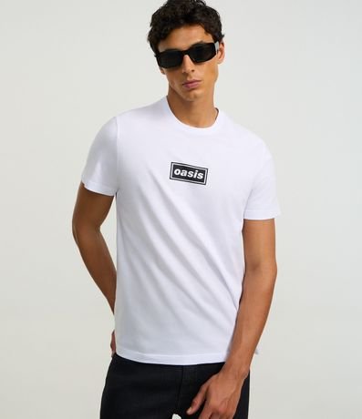 Camiseta masculina confeccionada em algodão mais sustentável com boas práticas ambientais, no modelo comfort. Possui gola redonda, manga curta e estampa lettering banda Oasis.
