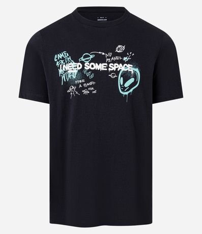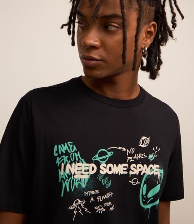 Camiseta masculina confeccionada em algodão mais sustentável, gola redonda, manga curta. Peça no modelo regular com estampa de aliens e lettering com a frase i need some space.
