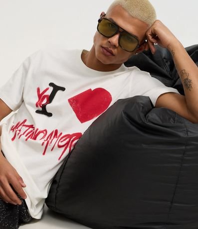 Ref: Camiseta masculina confeccionada em cotton mais sustentável através de boas práticas ambientais, no modelo regular. Possui gola redonda, manga curta, estampa de coração e escrita com estilo grafite.