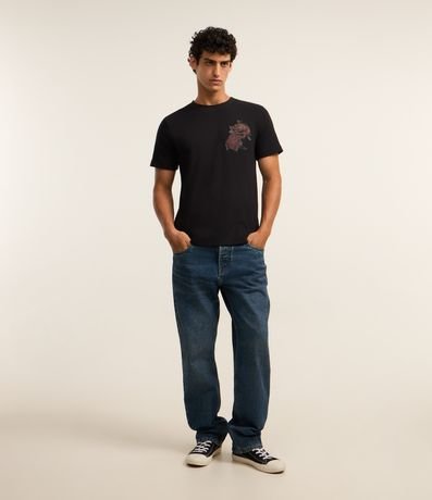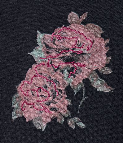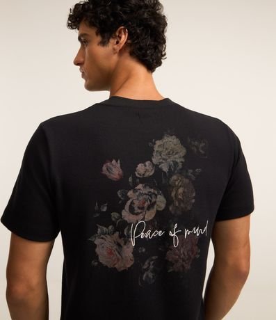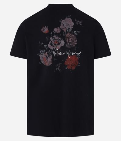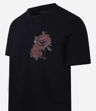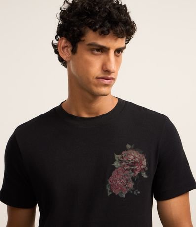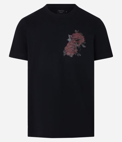 Ref: Camiseta confeccionada em algodão mais sustentável com boas práticas ambientais no modelo regular, com gola redonda, manga curta, estampa de rosas e bordados.