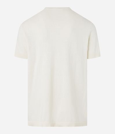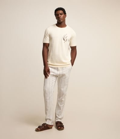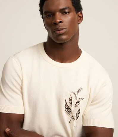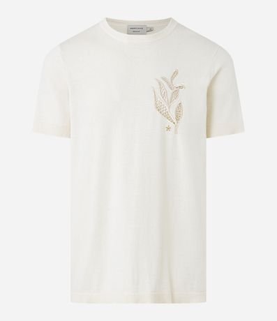Ref: Camiseta masculina confeccionada em algodão mais sustentável, gola redonda, manga curta. Peça no modelo regular com detalhe de flor bordada.