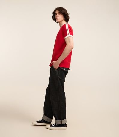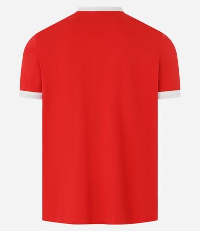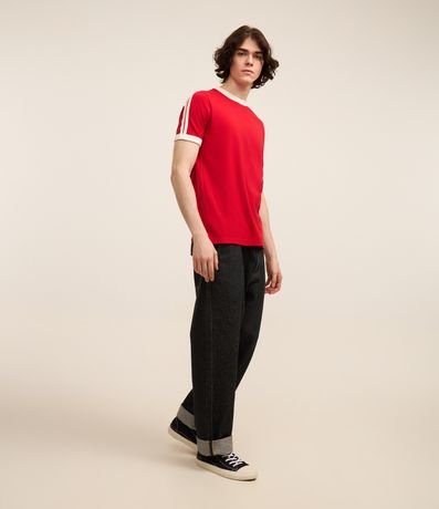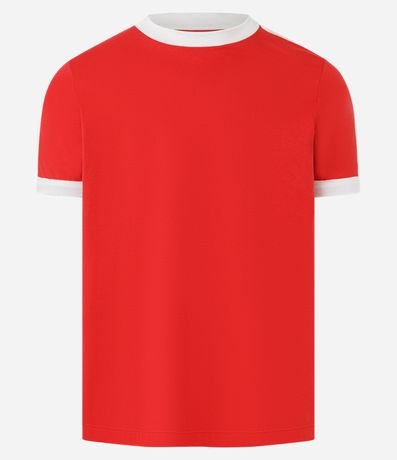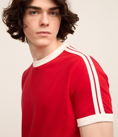 Ref: Camiseta masculina de modelo regular, com mangas curtas e confeccionada em malha de algodão mais responsável. Como detalhe possui listras no ombro, gola e barra da manga contrastante.