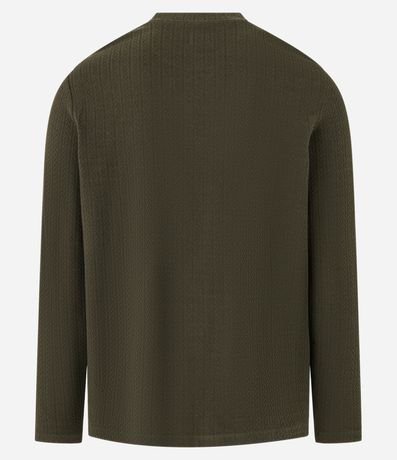 Ref: Camiseta masculina confeccionada em algodão mais sustentável, peça no modelo regular com gola redonda, manga longa e textura vertical com ícones em repetição de setinhas para cima.