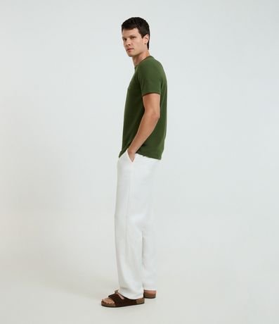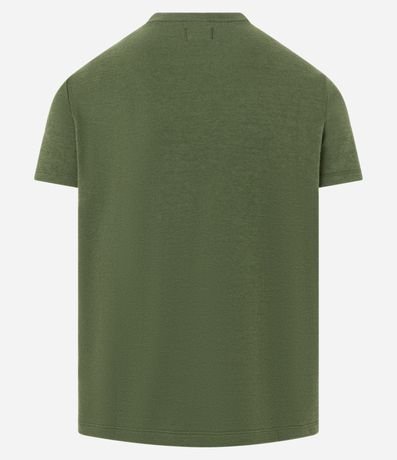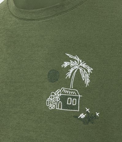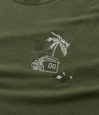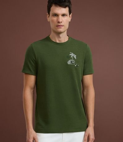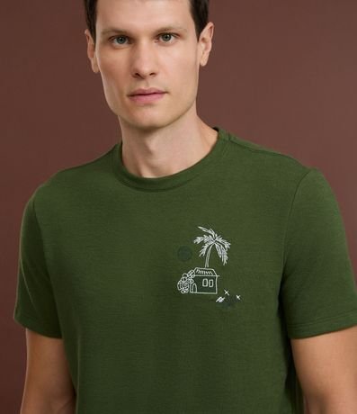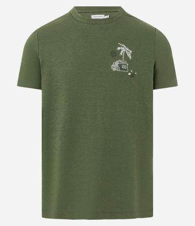 Ref: Camiseta masculina em algodão texturizado, com estampa tropical de casinha e coqueiro. Ideal para dias leves, com toque sustentável e visual descontraído.