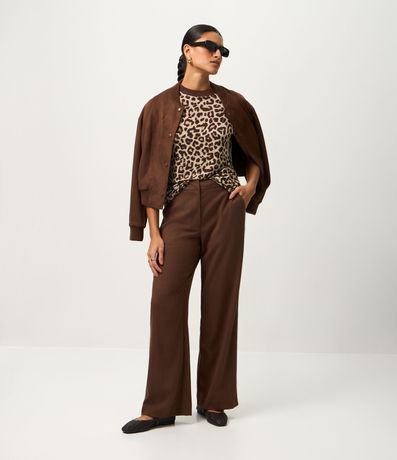 Camiseta feminina confeccionada em tricô mais sustentável através de boas práticas ambientais, no modelo regular. Possui gola alta redonda, contrastante, manga curta e estampa animal print de onça.
