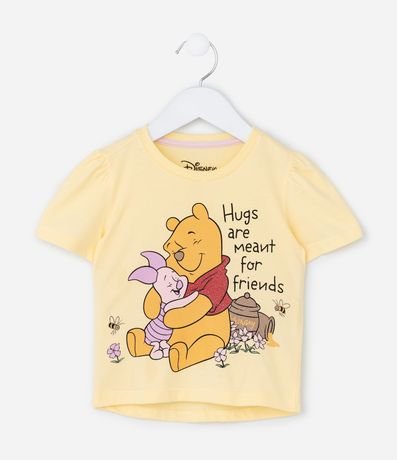 Ref: Camiseta infantil confeccionada em algodão mais sustentável através de boas práticas ambientais, no modelo regular. Possui gola redonda, manga curta, estampa do Ursinho Pooh com o Leitão e estampa lettering "Hugs are meant for friends".