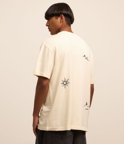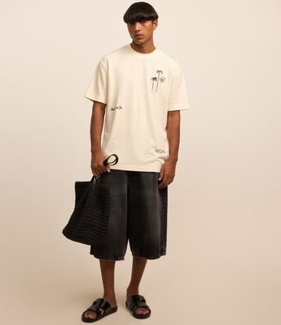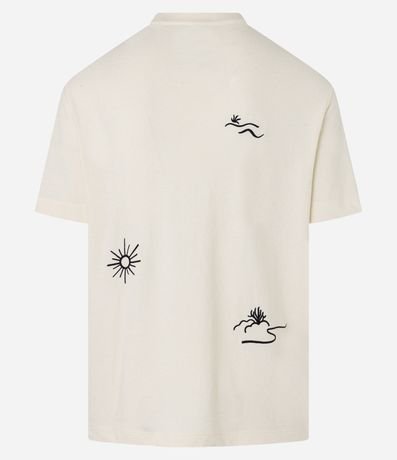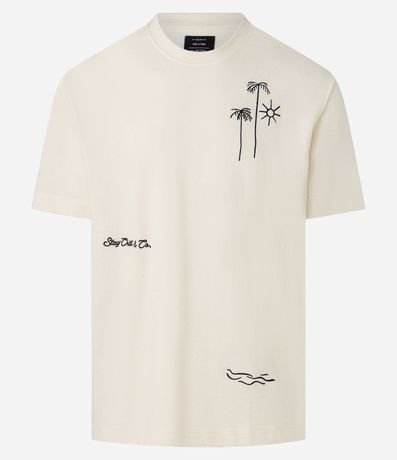 Ref: Camiseta masculina modelo relaxed com gola redonda, manga curta, estampa bordada de ícones como coqueiro, sol e confeccionada em material mais sustentável.
