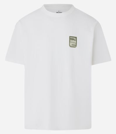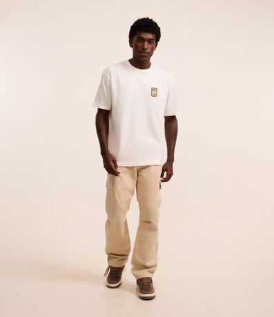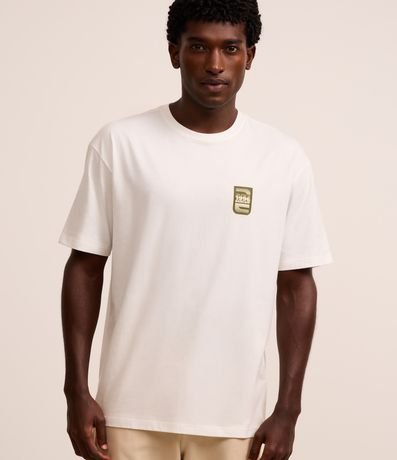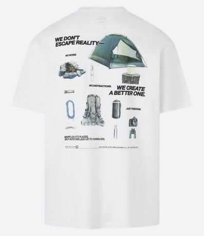 Ref: Camiseta masculina confeccionada em algodão mais sustentável com boas práticas ambientais no modelo relaxed, gola redonda, manga curta com estampa de ícones de acampar, estampa localizada frontal e estampa lettering traseira "We Don't Escape Reality "