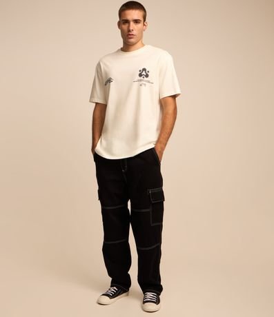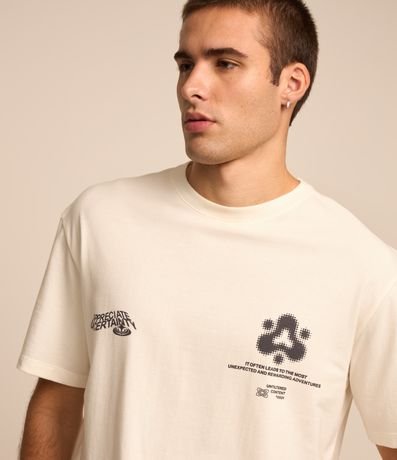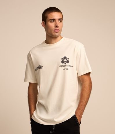 Ref: Camiseta masculina, confeccionada em material mais sustentável, gola redonda, manga curta. Peça contém estampa frontal com silks e leterring.