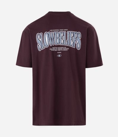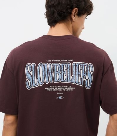 Camiseta masculina de manga curta confeccionada em algodão certificado Bci. Possui modelagem relaxed, gola redonda, estampa de lettering localizada na parte frontal e estampa maior nas costas.