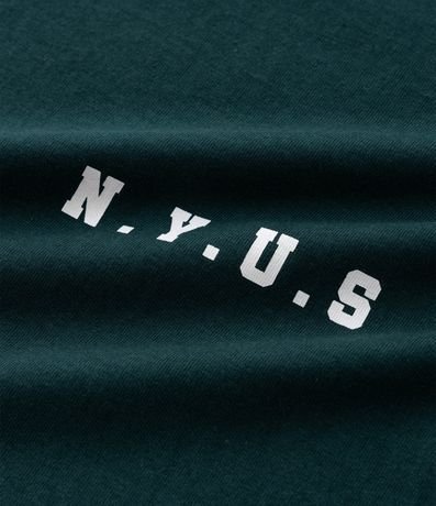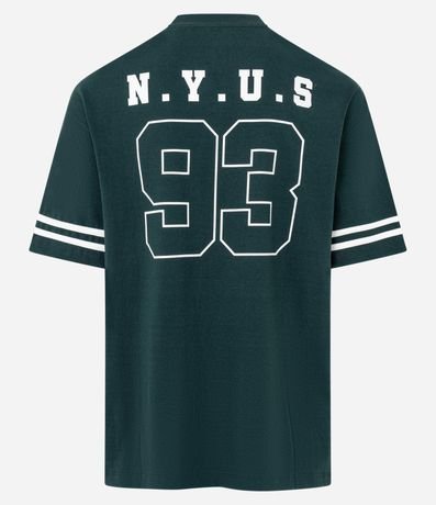 Ref: Camiseta masculina confeccionada em algodão certificado BCI e boas práticas ambientais, com modelagem relaxed, gola redonda, manga curta e estampa lettering NYUS 93 com listras nas mangas.