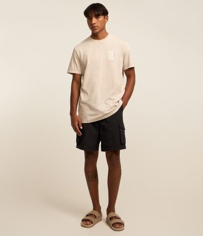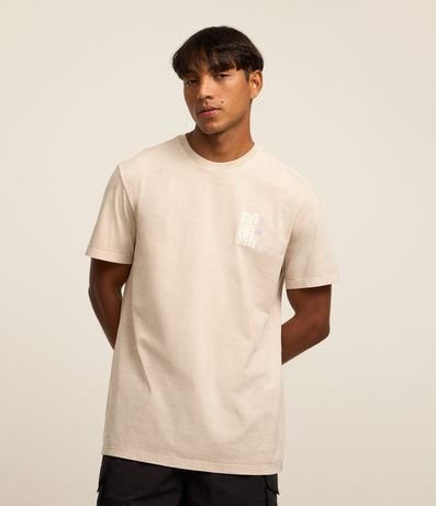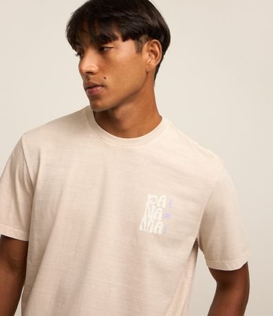 Camiseta masculina confeccionada em algodão estonado mais sustentável, no modelo relaxed com gola redonda, manga curta, estampa com ícones de praia.