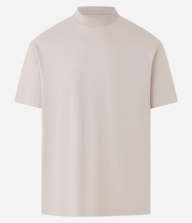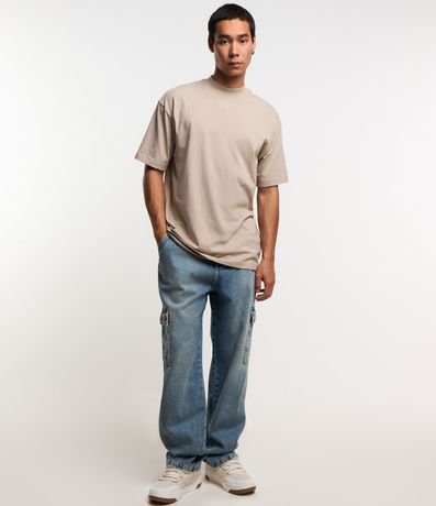 Camiseta relaxed masculina, confeccionada malha peruana, com gola média, mangas curtas, cavas deslocadas e sem estampa.