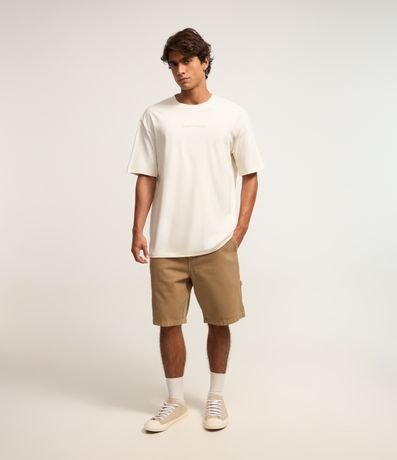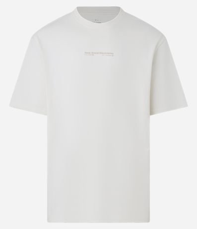 Camiseta masculina confeccionada em malhão, no modelo relaxed com estampa lettering, gola redonda e manga curta.