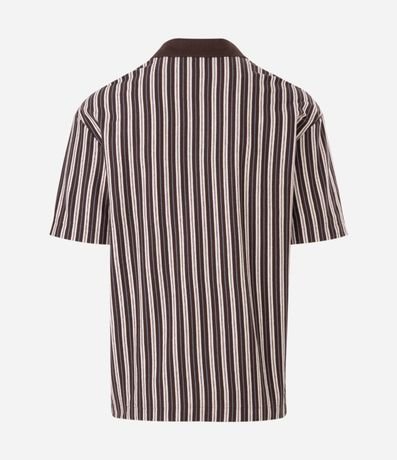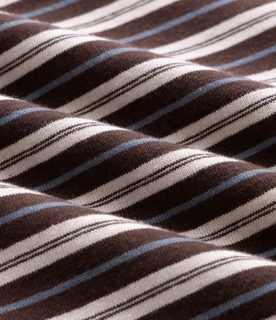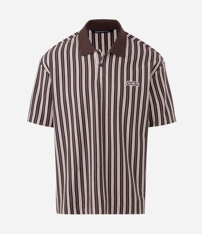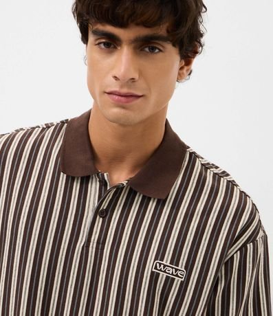 Ref: Camiseta masculina confeccionada em meia malha de algodão mais sustentável, com padronagem listrada em tom marrom, gola polo, manga curta e modelagem relaxed, ideal para um visual casual com inspiração outdoor.