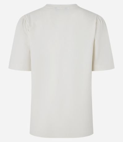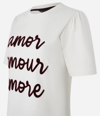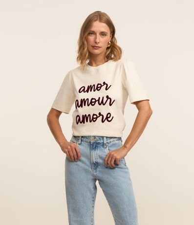 Camiseta feminina confeccionada em algodão com gola redonda, manga curta. Peça no modelo slim com estampa lettering amor, amour, amore.