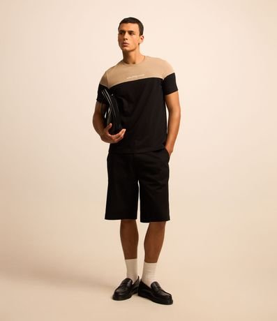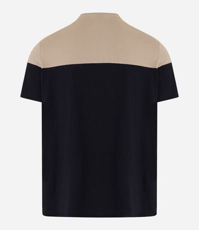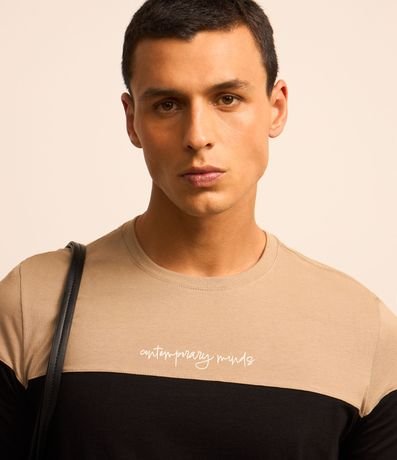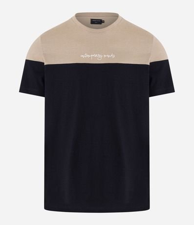 Camiseta masculina, confeccionada em algodão mais sustentável, gola redonda, manga curta. Peça com bloco de cores que contrastam e estampa localizada lettering.