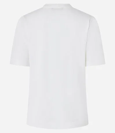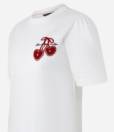 Camiseta feminina confeccionada em algodão mais sustentável com boas práticas ambientais, no modelo slim. Possui gola redonda, manga curta, com frufru, estampa localizada de coração cereja e lettering "Amore mio".
