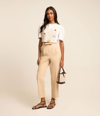 Camiseta feminina confeccionada em malha de algodão mais responsável, de modelo slim, com gola redonda e mangas curtas. Possui estampa frontal de xadrez grid e doodles, com alusão ao piquenique.
