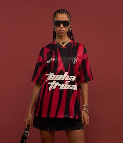 T-shirt esportiva com gola em v, peça com manga curta e estampa diferenciada com referencia lettering  à dupla de  rappers Tasha & Tracie.