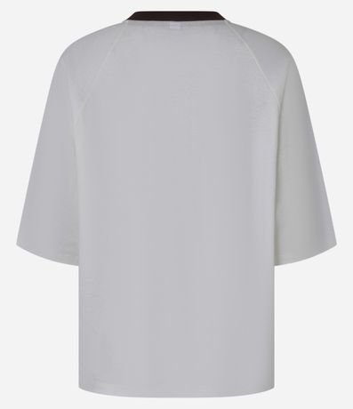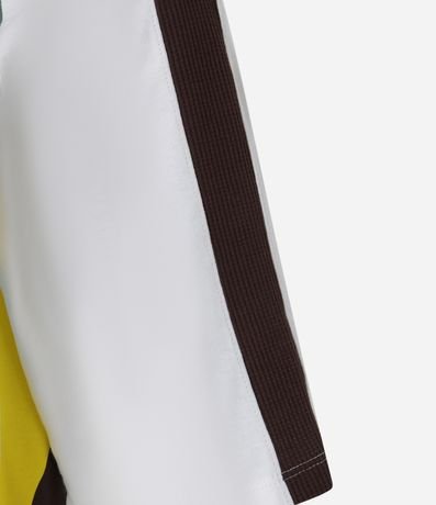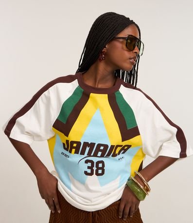 Ref: Camiseta feminina com influência Sportcore, confeccionada em malha de algodão mais responsável, com gola redonda e mangas curtas amplas. Possui estampa geométrica e lettering "Jamaica 38". A peça conta com gola e laterais das mangas com recorte em ribana.