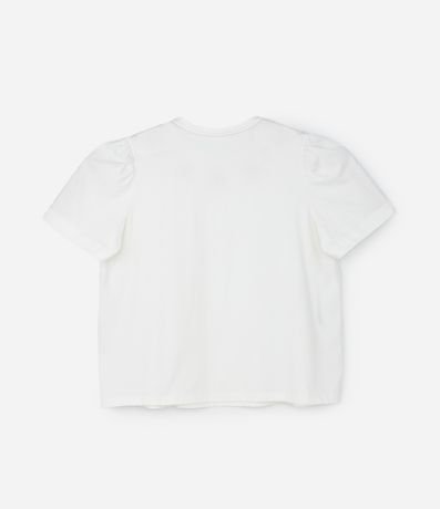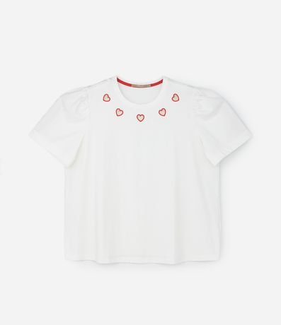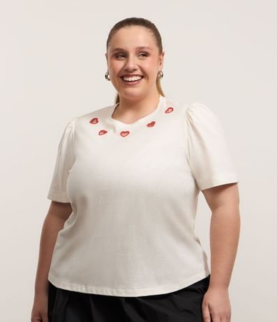 Ref: Camiseta feminina Curve & Plus Size, confeccionada em algodão mais sustentável em boas práticas ambientais, peça no modelo t-shirt e contém gola redonda com colar de corações fofos bordados vazados e contrastantes, manga curta.