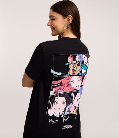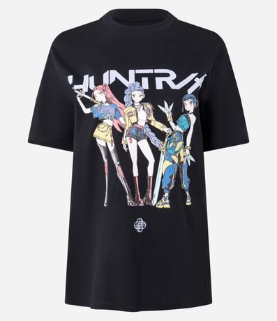 Ref: Camiseta feminina confeccionada em algodão certificado bci com gola redonda, manga curta. No modelo t-shirt peça contem estampa das icônicas guerreiras do k-pop, nomeadas de Huntrix contra os demônios do ma.