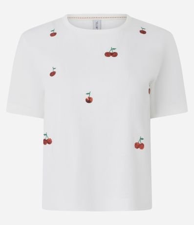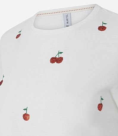 Ref: Camiseta feminina confeccionada em algodão certificado bci com boas práticas ambientais, no modelo t-shirt, gola redonda, manga curta e estampa bordada de cereja.