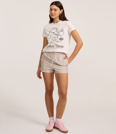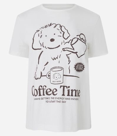 Ref: Camiseta feminina confeccionada em algodão certificado bci com gola redonda, manga curta. Peça no modelo t-shirt com estampa de um fofo cachorrinho servindo café e lettering Coffe Time.