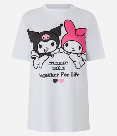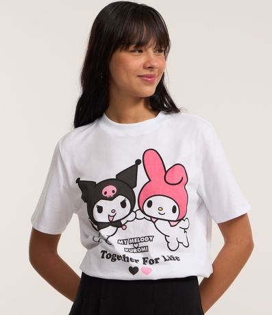 Ref: Camiseta feminina confeccionada em algodão mais sustentável através de boas práticas ambientais, no modelo T-Shirt. Possui gola redonda, manga curta, estampa e lettering "My Melody e Kuromi".