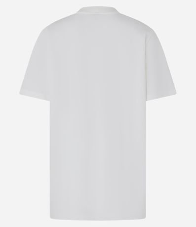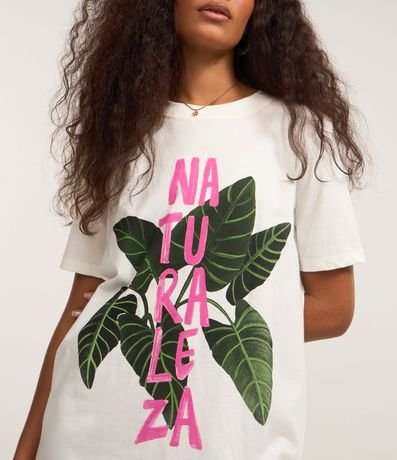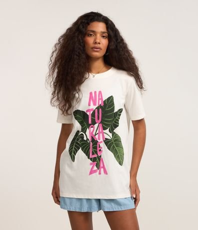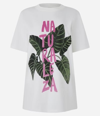 Ref: Camiseta alongada, t-shirt com manga curta, confeccionada em algodão mais sustentável e estampa frontal de folhagem com lettering Naturaleza.