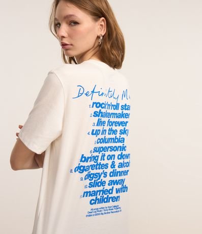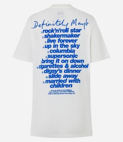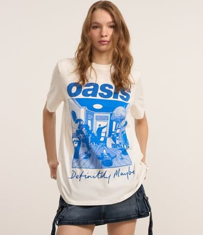 Ref: Camiseta feminina confeccionada em Algodão Certificado Bci, peça no modelo t-shirt, gola redonda, manga curta e estampa em homenagem a banda Oasis.