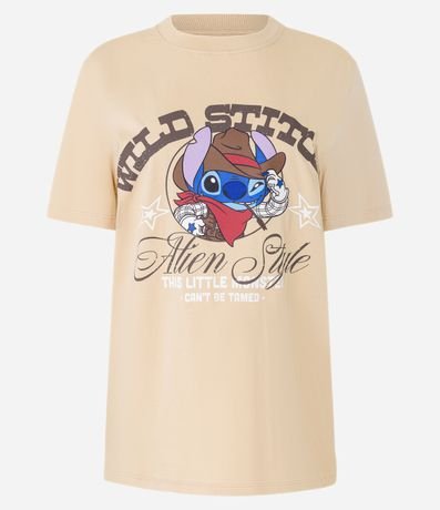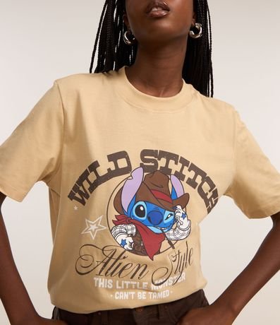 Ref: Camiseta feminina confeccionada em algodão mais sustentável através de boas práticas ambientais, no modelo t-shirt. Possui gola redonda, manga curta, estampa de Stitch cowboy e estampa lettering "Wild Stitch".