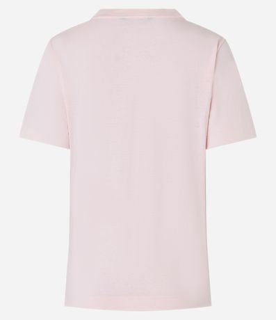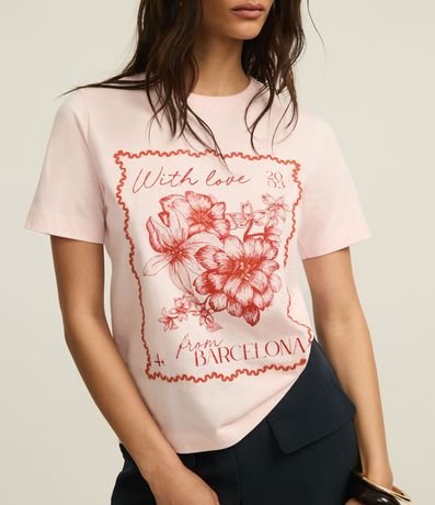 Ref: Camiseta feminina confeccionada em algodão certificado bci com boas práticas ambientais, peça com gola redonda, manga curta e estampa com moldura, flores e lettering with love from Barcelona.