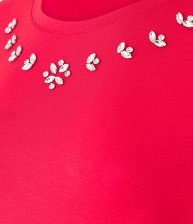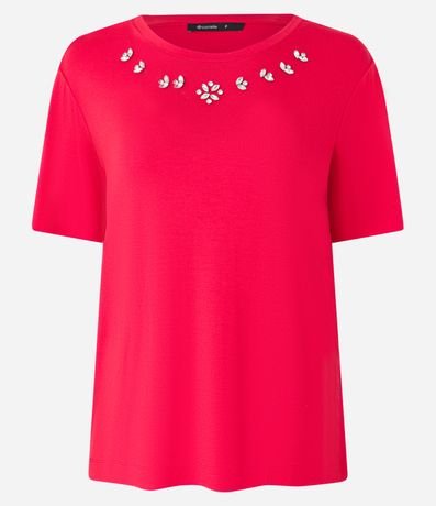 Ref: Camiseta feminina confeccionada em viscose certificada, peça no modelo t-shirt com manga curta e gola redonda com aplicação de strass.