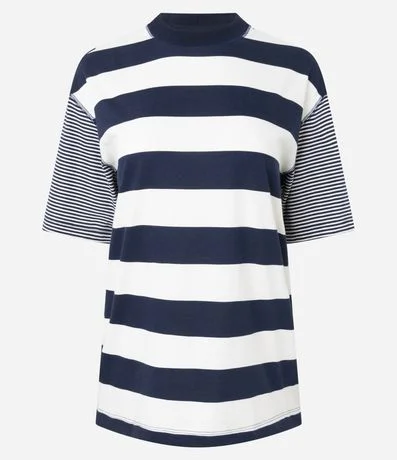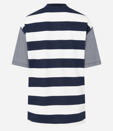 Ref: Camiseta t-shirt de cavas deslocadas e mangas curtas, confeccionada em algodão, com gola redonda e listras horizontais. A peça tem costuras aparentes nas cavas e listras mais finas nas mangas. Este produto possui algodão certificado BCI em sua composição, sendo ambientalmente mais responsável.