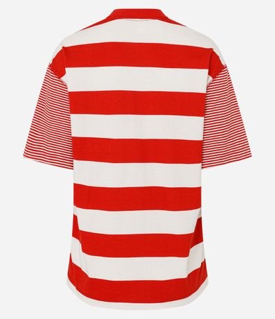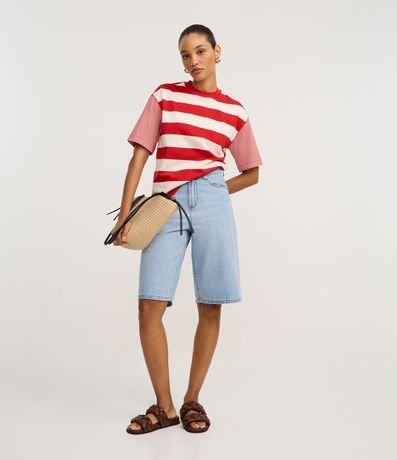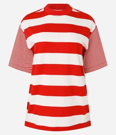 Ref: Camiseta t-shirt de cavas deslocadas e mangas curtas, confeccionada em algodão, com gola redonda e listras horizontais. A peça tem costuras aparentes nas cavas e listras mais finas nas mangas. Este produto possui algodão certificado BCI em sua composição, sendo ambientalmente mais responsável.