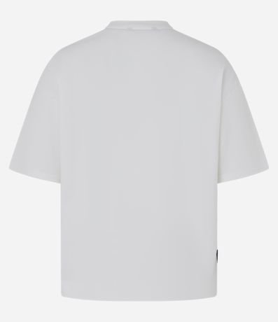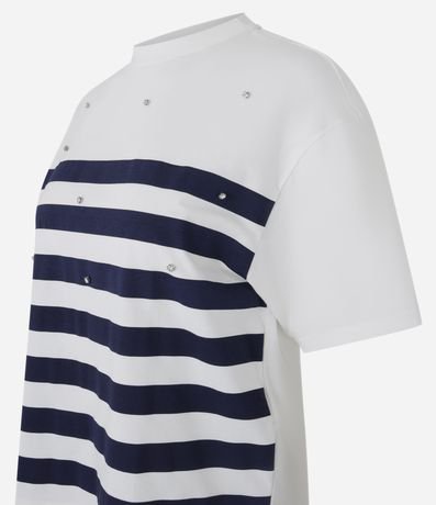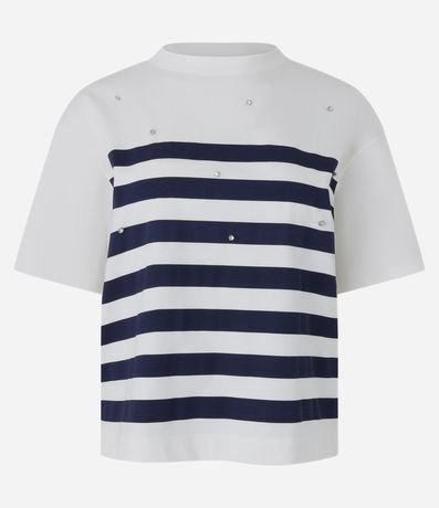 Ref: Camiseta manga curta confeccionada com algodão mais sustentável. Peça com estampa de listras e strass.