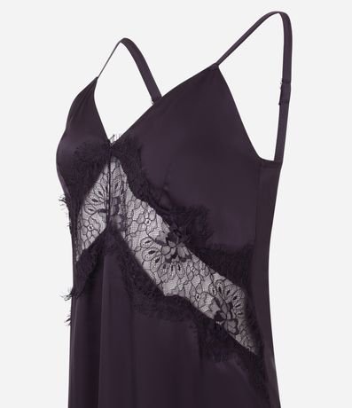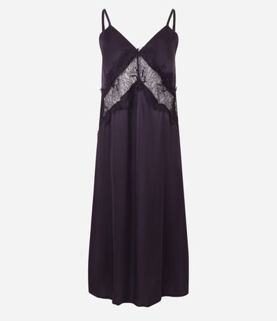 Camisola acetinada feminina com alças finas reguláveis, recorte frontal em renda vazada contrastante, modelagem longa, decote em v, estrutura leve e caimento solto, garantindo conforto. O tecido acetinado oferece toque suave e deslize fácil ao vestir.