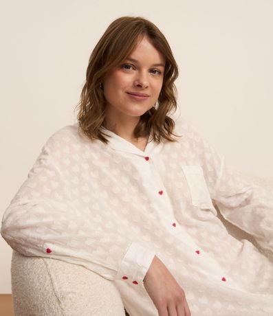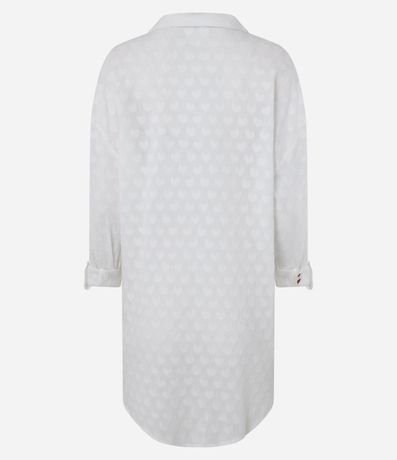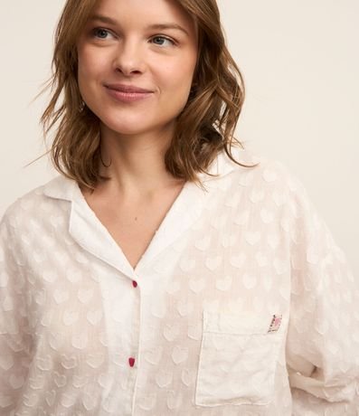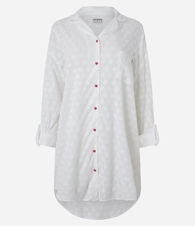 Ref: Camisola de chalis - um tecido leve confeccionado a partir de algodão BCI. A peça tem estilo camisa com gola lapela, abotoamento frontal e martingale nas mangas. Os detalhes da superfície texturizada de corações, os botões contrastantes de coraçãozinho e a barra mullet tornam essa camisola super especial!