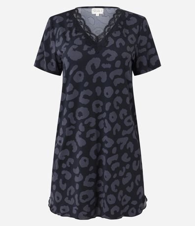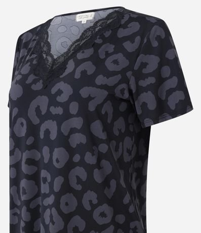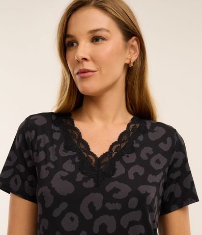 Ref: Camisola curta confeccionafa em microfibra leve e estampada de animal print onça. A peça tem decote V com renda e mangas curtas.