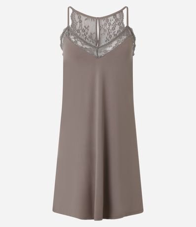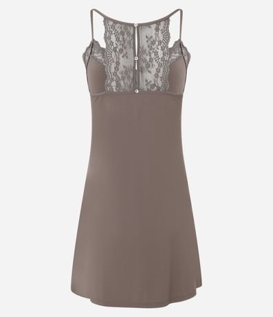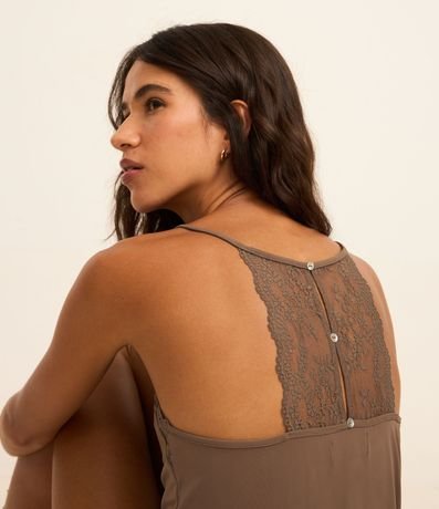 Ref: Camisola curta confeciconada em microfibra sem estampa. A peça tem alças finas fixas, decote V e aplicação de renda com botões nas costas.